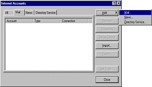 2. In the popup Accounts screen click on the Mail Tab then click on the Add button and pick Mail.